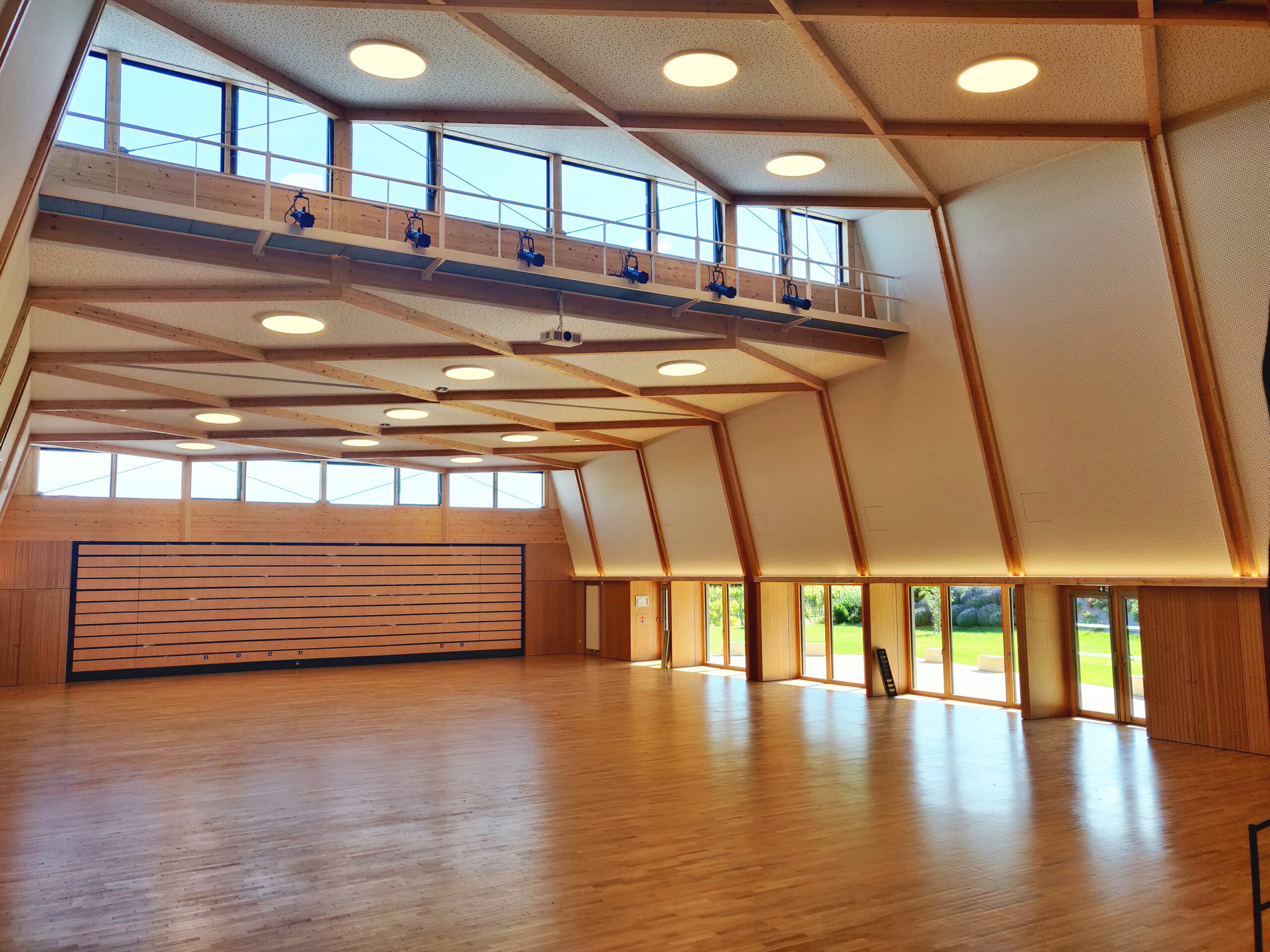 La grande salle (475 m²) s’ouvre sur une terrasse extérieure et offre une vue sur un élément patrimonial remarquable. Modulable, elle peut être divisée en plusieurs espaces grâce à un dispositif de séparation. L’éclairage, à la fois zénithal et latéral, est entièrement modulable, tandis que la salle peut être occultée selon les besoins. Une tribune télescopique de 200 places complète l’aménagement.
